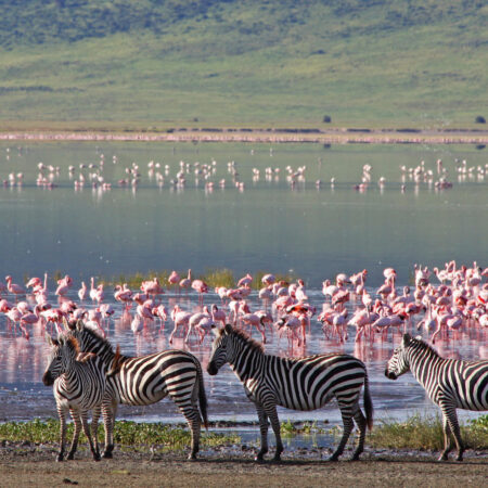 Rise before sunrise for breakfast, then descend into the Ngorongoro Crater for up to six hours of exceptional game viewing. The crater floor offers one of the highest concentrations of wildlife in Africa, with chances to see lions, elephants, buffalo, hyenas, hippos, and possibly the endangered black rhino.