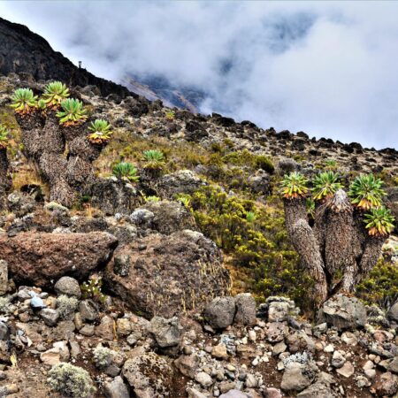 Lava Tower Junction: Hike through diverse landscapes towards the Lava Tower (4,500 meters), one of Kilimanjaro’s most famous geological features.